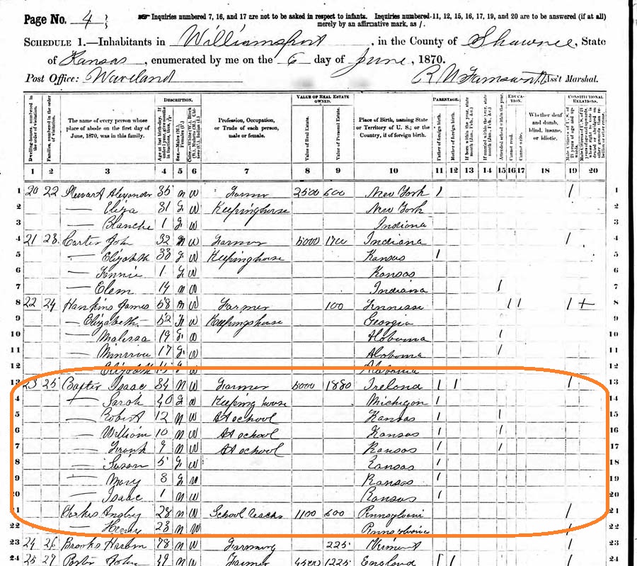 Isaac Baxter and his family as they appeared in the 1870 census for Shawnee