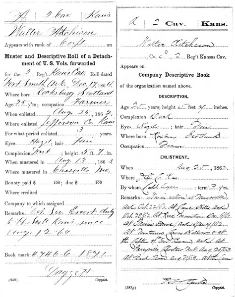 Civil War muster roll card for Walter Aitchison. A native of Scotland, his family came to the U.S. in about 1857. He lived south of Frank. He died at a relatively young age in 1875 and is buried in the Ridgeway Cemetery, in Osage County, Kansas.