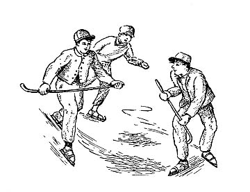 If one of the captains struck the ball as it fell, it was "high buck," and the ball was in play. If he missed, "low doe" got the ice lick. Then twenty or more skaters rushed for the ball, sometimes bunching and falling, but seldom getting hurt. It was an exciting sport and put a glow into our cheeks.