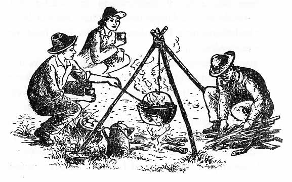 By morning the Smith family had resolved to start back towards Denver. We bade them goodbye with deep concern for their safety. The daughter Elizabeth was a large comely girl about my age. Since her shoes had worn thin from mountain climbing, I let her take my extra pair of slippers. We boys lost no time in moving camp, hastily throwing blankets, cooking utensils, picks, shovels, pans, and other equipment into the wagon. Half a mile up the gulch we found a grassy field where we pastured our oxen. We pitched our tent in a narrow valley, facing a well-worn path made by deer. Icy waters from mountain snows tumbled over nearby rocks, forming a sparkling rivulet.