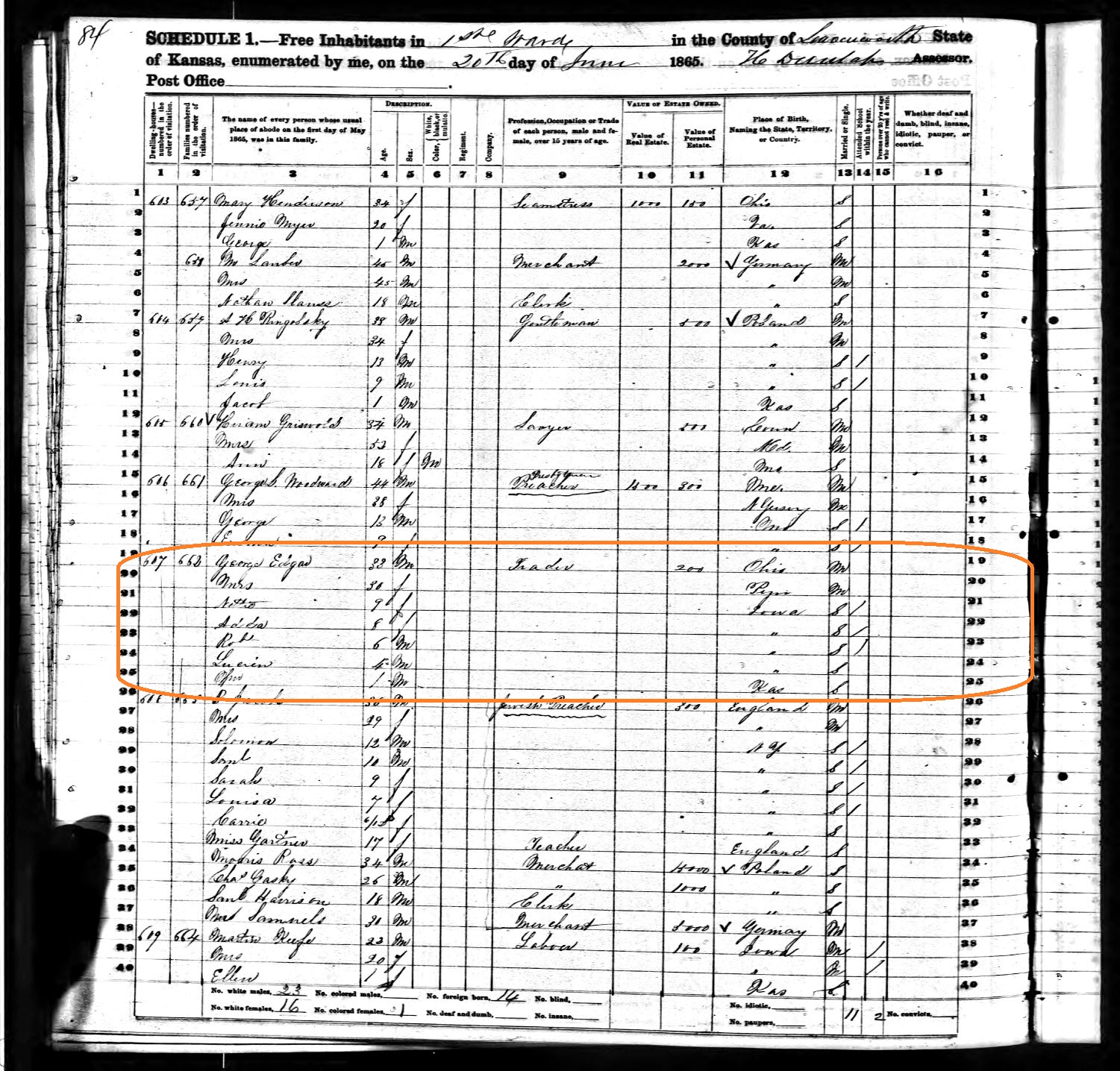 George Edgar of Leavenworth, listed on this page of the 1865 state census as a trader