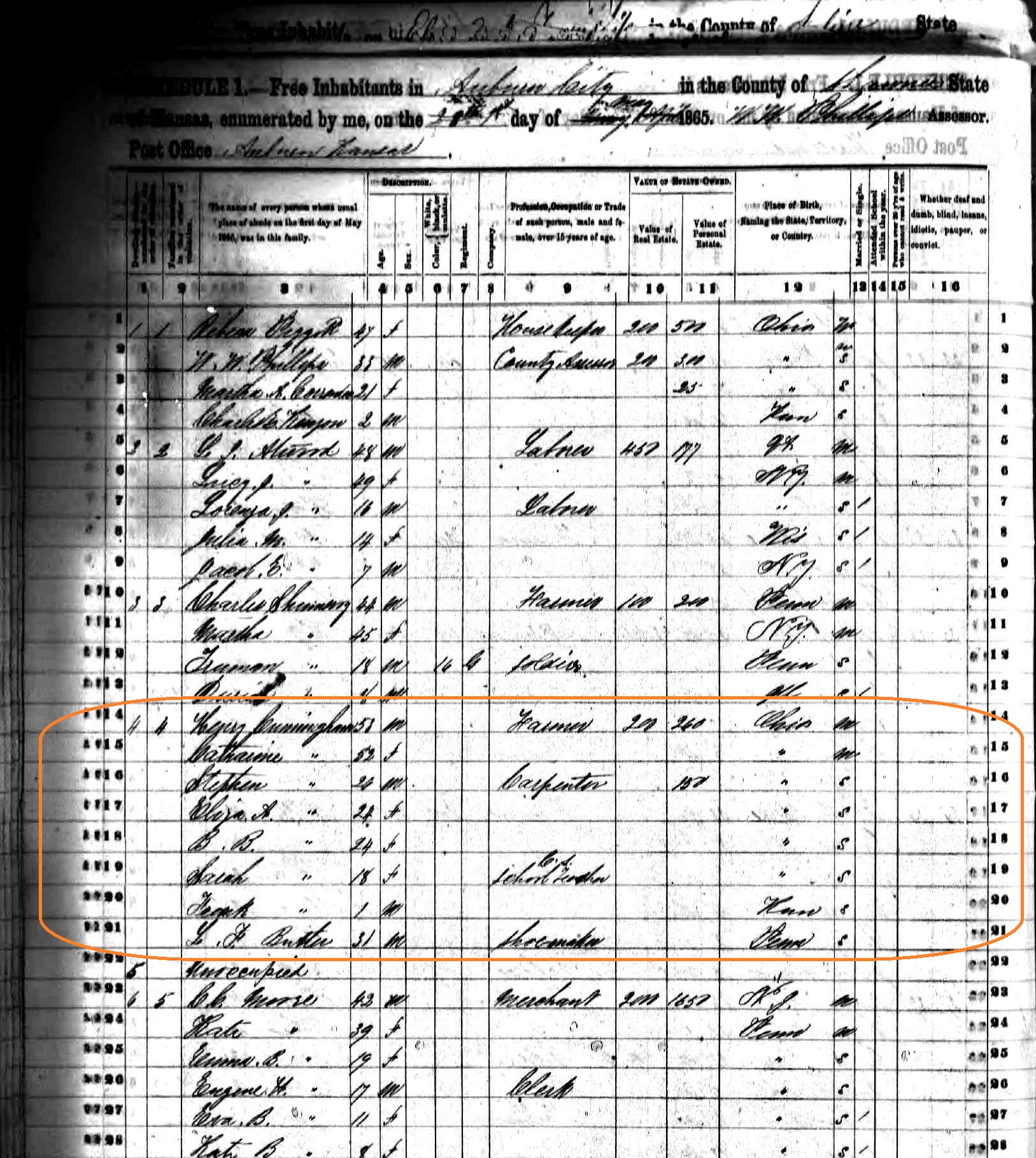 Henry Cunningham, who had been a neighbor of Frank and his family in New Harrison, Ohio. The Cunninghams had moved to Auburn sometime after 1860 and appear in the 1865 census below on line 14. According to the local paper he was considered a "fixture" of Auburn due to his owning a local public house and the stage station.