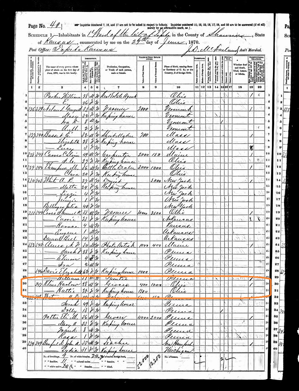 Harlow Kline was also from Ohio. He appears in the 1870 census in Topeka (line 30) working as a grocer, along with his wife Hattie.