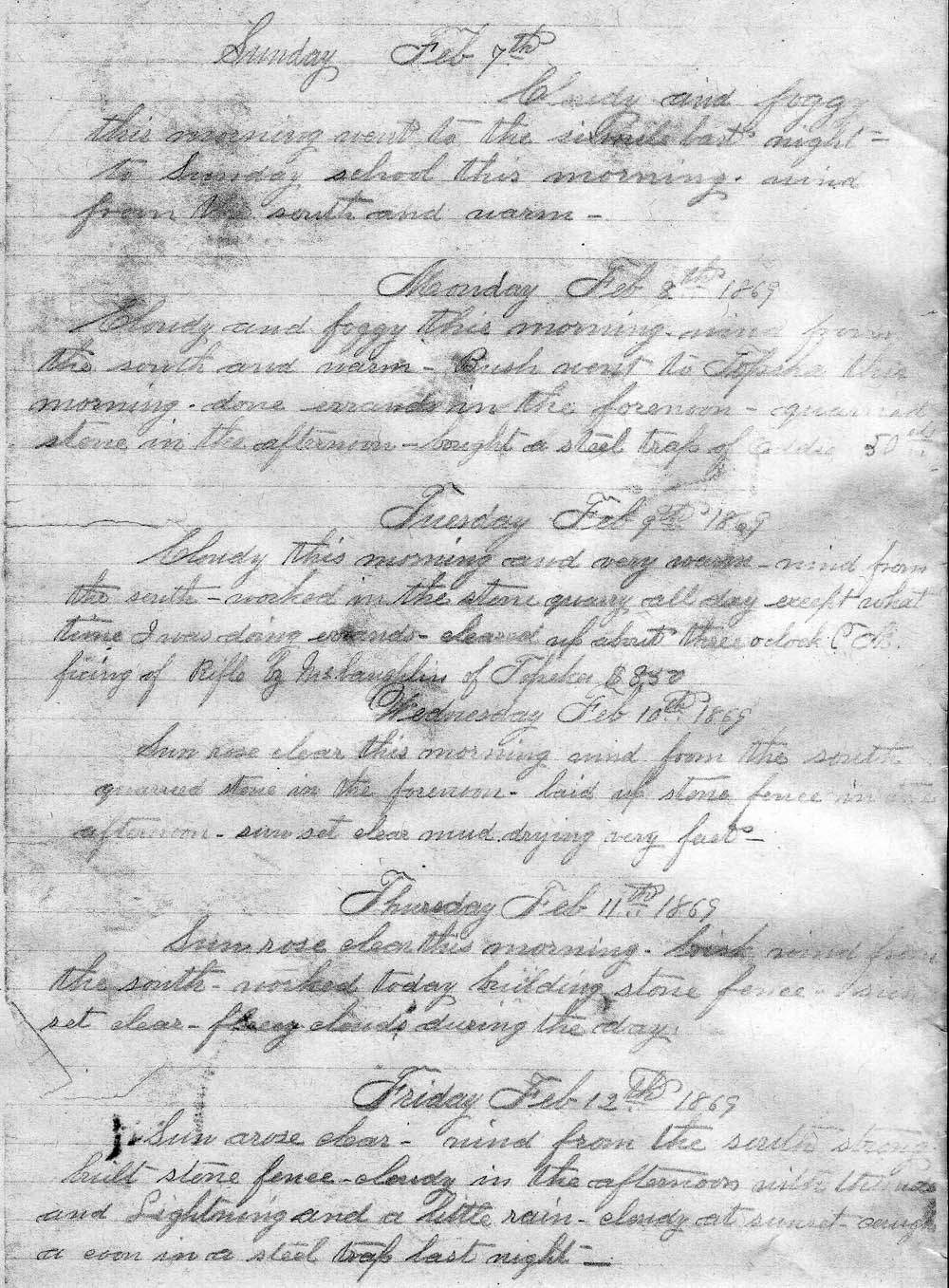 Monday, Feb. 8th, 1869 - Cloudy and foggy this morning. Wind from the South and warm. Bush went to Topeka this morning. Done errands in the forenoon. Quarried stone in the afternoon. Bought a steel trap of Eddie , 50 cts..Tuesday, Feb. 9, 1869 - Cloudy this morning and very warm. Wind from the south. Worked in the stone quarry all day except what time I was doing errands. Cleared up about three o'clock P.M.. Fixing of rifle by McLaughlin of Topeka - $8.50.