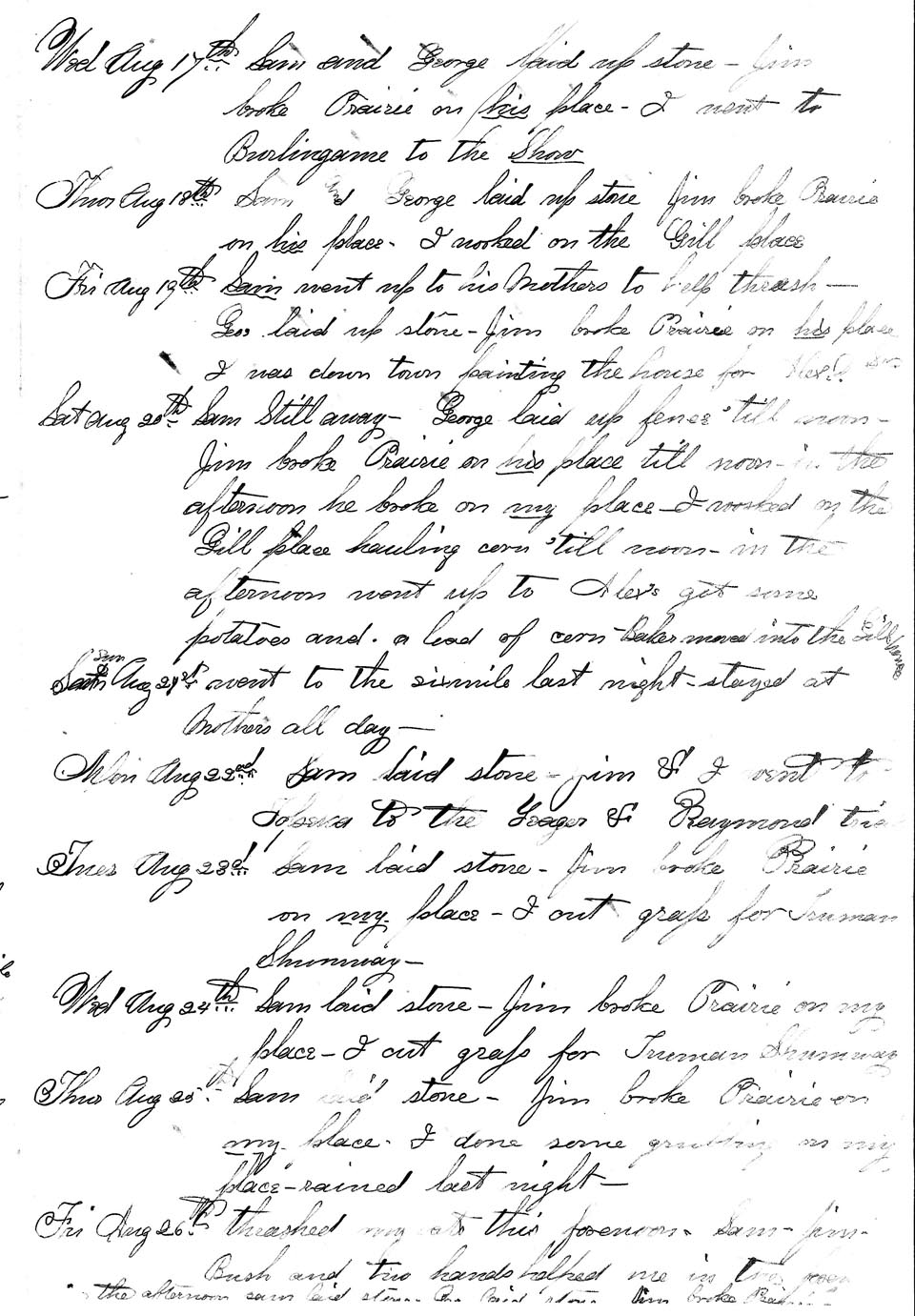 Fri., Aug. 26th - Thrashed my oats this forenoon. Sam, Jim, Bush, and two hands helped me in the forenoon. In the afternoon Sam laid stone. Geo. laid stone. Jim broke prairie.
