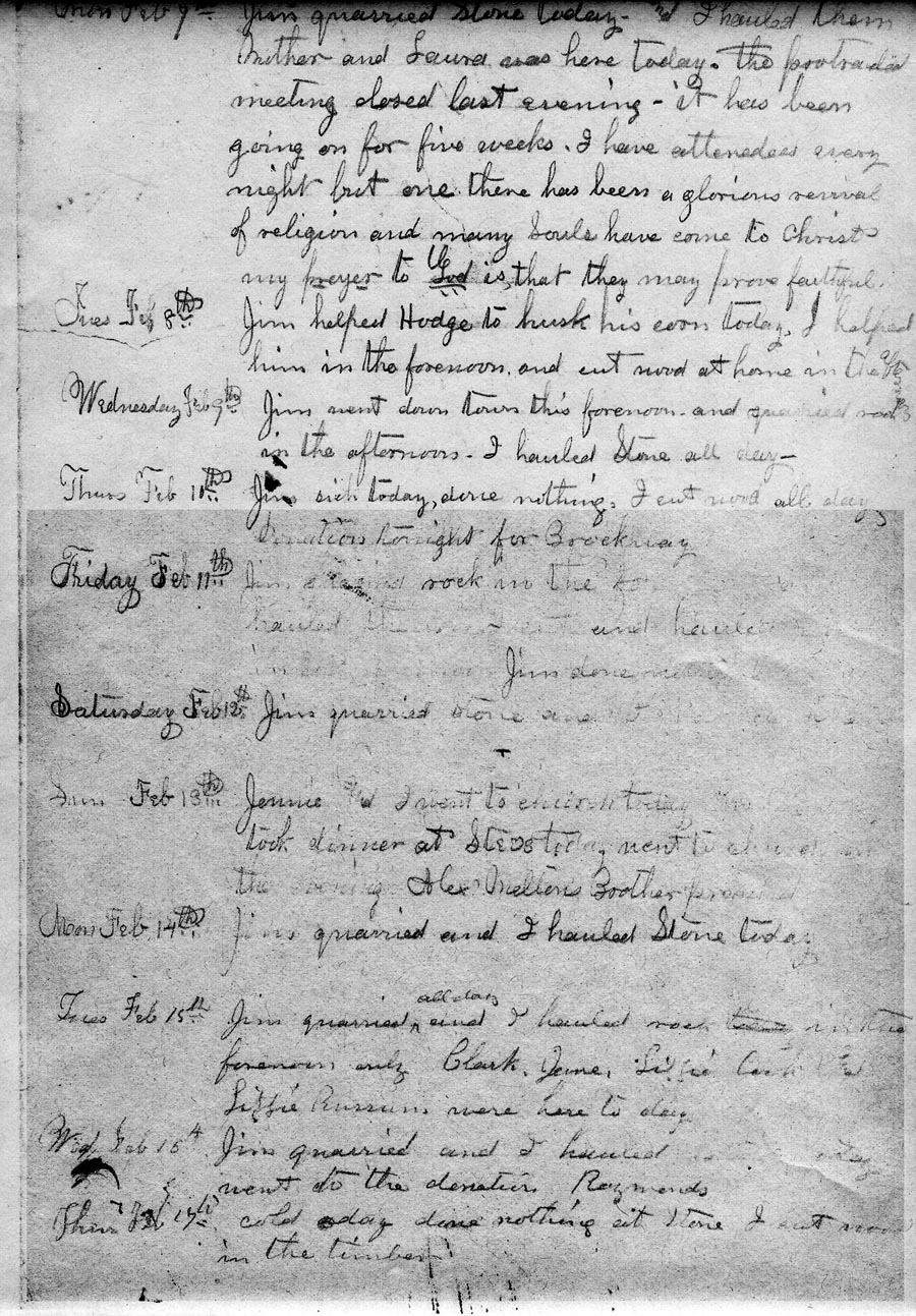 Mon. Feb. 7th - Jim quarried stone today and I hauled them. Mother and Laura was here today. The protracted meeting closed last evening. It has been going on for five weeks. I have attended every night but one. There has been a glorious revival of religion and many souls have come to Christ. My prayer to God is that they may prove faithful.