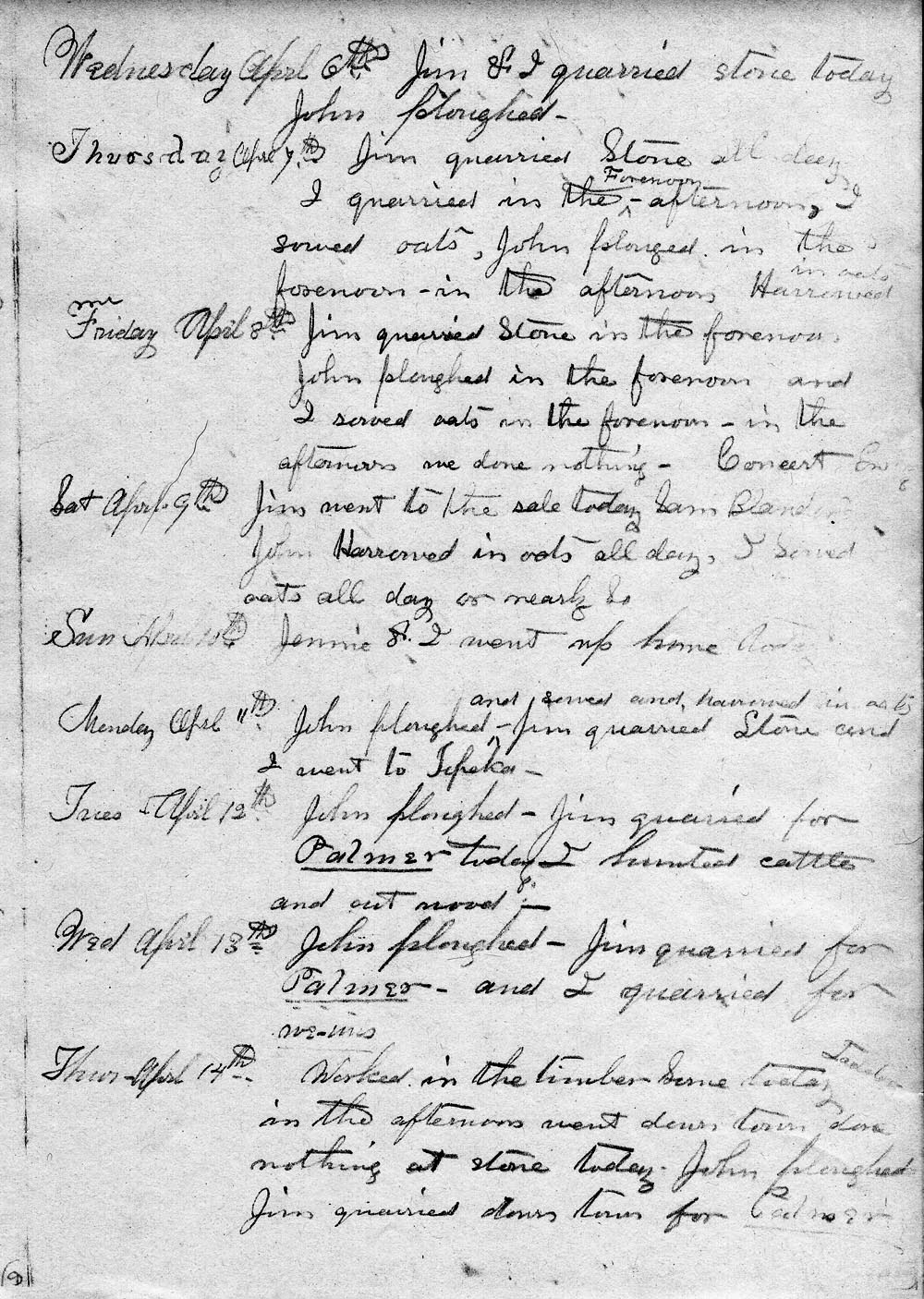 Mon., Mar. 21st - John Horton commenced to work for me by the month at $20.00 per month. He hauled wood and went to town in the forenoon, ploughed in the afternoon. I quarried stone today.