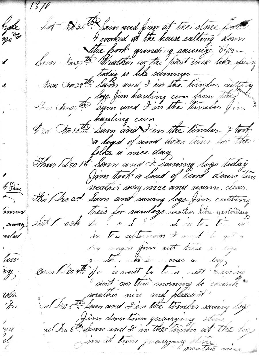 Sat., Dec. 3rd - Sam and I sawed in the timber. In the afternoon I went to get a log wagon. Jim cut trees for logs. Weather like summer all day.