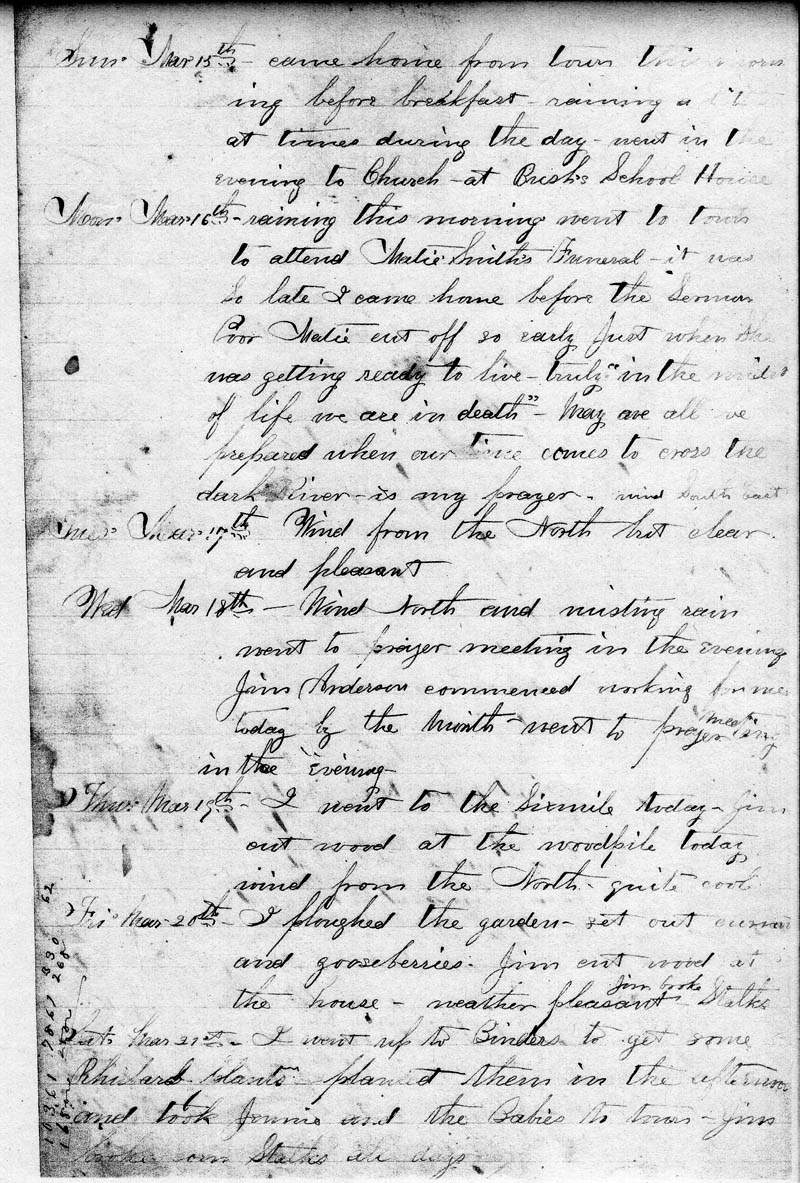 Wed., Mar. 18th - Wind South and misting rain. Went to prayer meeting in the evening. Jim Anderson commenced working for me today by the month. Went to prayer meeting in the evening.