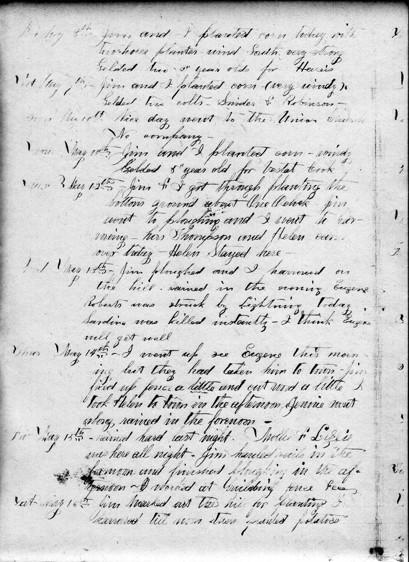 Wed., May 13th - Jim ploughed and I harrowed on the hill. Rained in the evening. Eugene Roberts was struck by lightning today. Sardine was killed instantly. I think Eugene will get well.