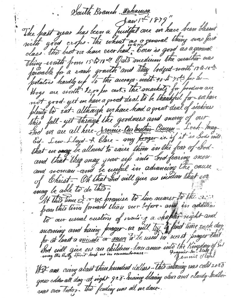 South Branch Wakarusa, Jan. 1st, 1879 - The past year has been a fruitful one. We have been blessed with good crops. The wheat as a general thing was first class, the best we have ever had, 60 to 75. Corn is good as a general thing, worth from 15 to 18 cts. Oats medium. The weather was favorable for a rank growth and they lodged worth 13 to16 cts. Potatoes hardly up to the average, worth 40 to 75 cts. per bu. Hogs are worth $2.00 per cwt. The markets for produce are not good yet we have a great deal to be thankful for.