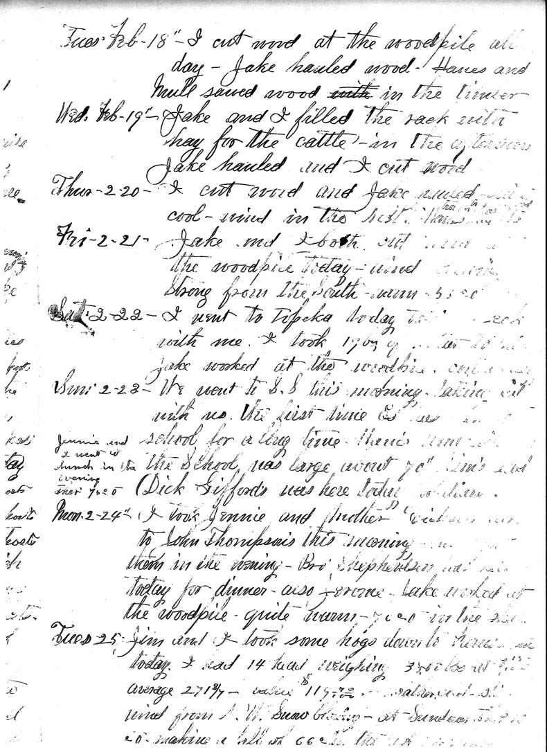 Sat., 2-22 - I went to Topeka today, taking Aleck with me. I took 19 bu of wheat to _____. Jake worked at the woodpile. Cool ___