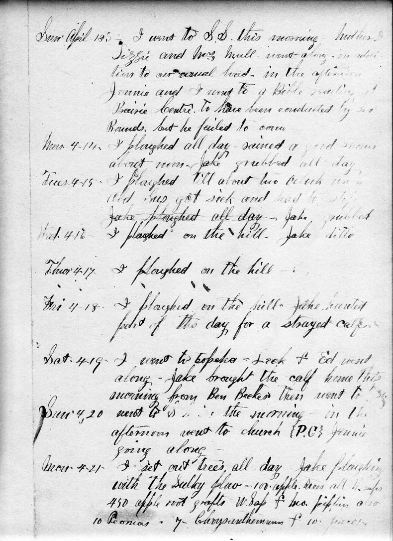 Sat., 7-26 - I spent the forenoon looking for a calf that got [out] of the pasture. Did not find it. Jake went to Topeka today to attend the Big Show. In the afternoon I ploughed a little. Leck stayed with Lizzie last night, Jim being away at Topeka. Kate united.