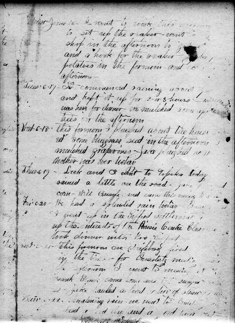 Mon., 8-25 - I went to Burlingame this morning with Mr. Foss to see Allen Blandon who is very poorly. Had a shower of rain about noon. Got wet. Took dinner at Foss's. Jake cut corn. I helped a while in the afternoon. There was 22 shocks put up today, 41 before ___ ____
