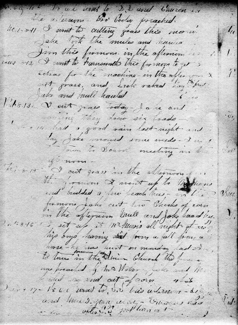 Sat., 8-16 - I set up at Mr. Morris all night, one of his boys having died from a fall from a horse. He was hurt on Monday last. I went to town in the forenoon at the Union church. The sermon was preached by Mr. Waters. Jake and Mull hauled hay and cut up corn. 4 bales.