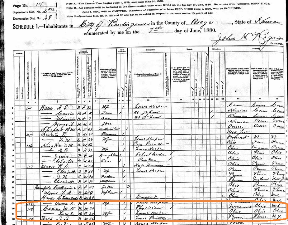 M.H. Cazier, a physician living in Burlingame, seen here in the 1880 census.
