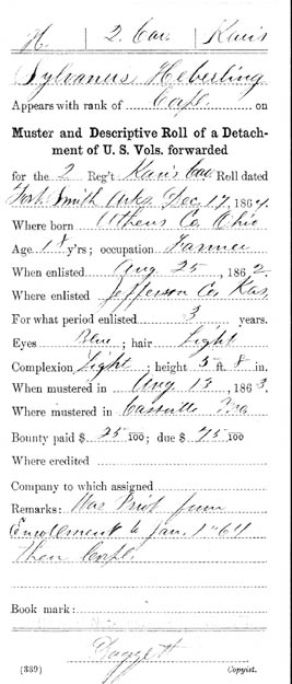 Sylvanus Heberling was born in Ohio but had moved to Kansas by the outbreak of the war. He lived south of Frank in Osage county. He died in 1915 and is buried in the